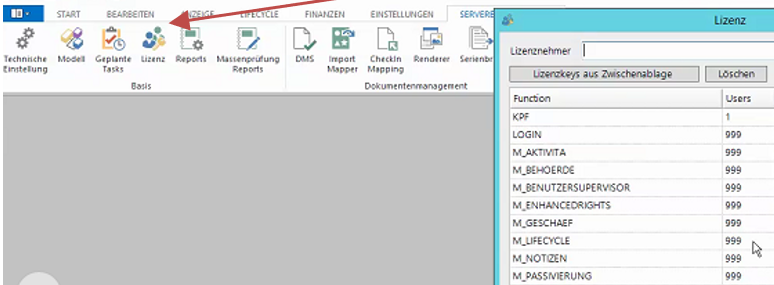 Der Systemlieferant muss im Test- und im Produktivsystem die Lizenzen folgender Module eingelesen haben: Lifecycle (Lizenz M_LIFECYCLE), Passivierungsassistent (Lizenz M_PASSIVIERUNG) und Ablieferungsschnittstelle (Lizenz M_ABLIEFERUNG). Um festzustellen, ob die Lizenzen verfügbar sind, müssen Sie Administratorenrechte haben -> Tab «Servereinstellungen» -> «Lizenz».