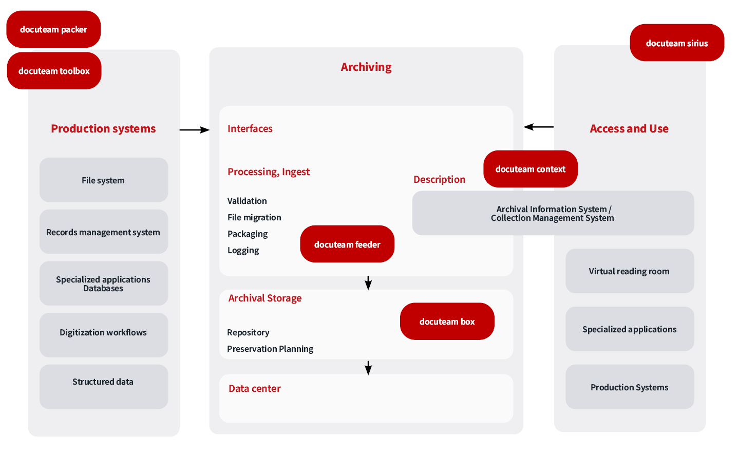 A digital long-term archive is a complex system made up of various components. The various docuteam cosmos applications perform specific tasks and functions within an OAIS.