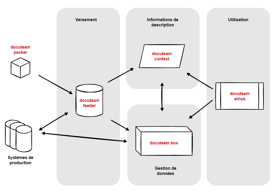 Qu’il s’agisse d’archivage numérique à long terme, de saisie et de gestion des métadonnées ou de publication, nos solutions logicielles modulaires couvrent tous les aspects de l’archivage conformément au modèle de référence OAIS. Elles permettent ainsi de couvrir une large palette des besoins de notre clientèle. Une documentation sur les différentes applications est disponible sur docs.docuteam.ch.